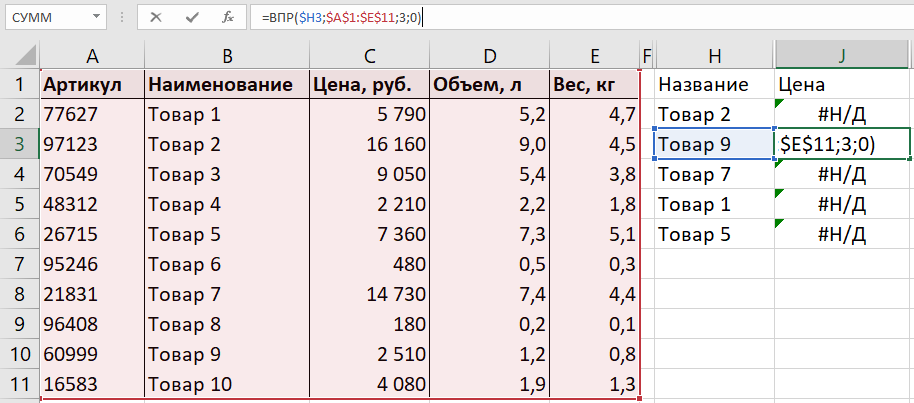 - Таблица – ссылка на основную таблицу. Фиксируем долларами (см. пример), так как таблица одна и ссылки на нее не должны меняться при смещении самой формулы;