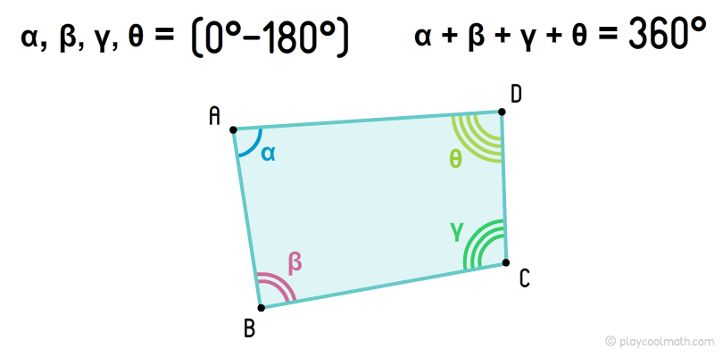 Выпуклый четырехугольник — это четырехугольник, у которого все углы выпуклые (от 0° до 180°, не включая эти значения). Сумма всех углов выпуклого четырехугольника всегда равна 360°