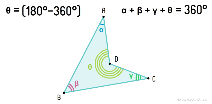 Вогнутый четырехугольник — это четырехугольник, у которого один угол вогнутый (от 180° до 360°, не включая эти значения). Сумма всех углов вогнутого четырехугольника всегда равна 360°