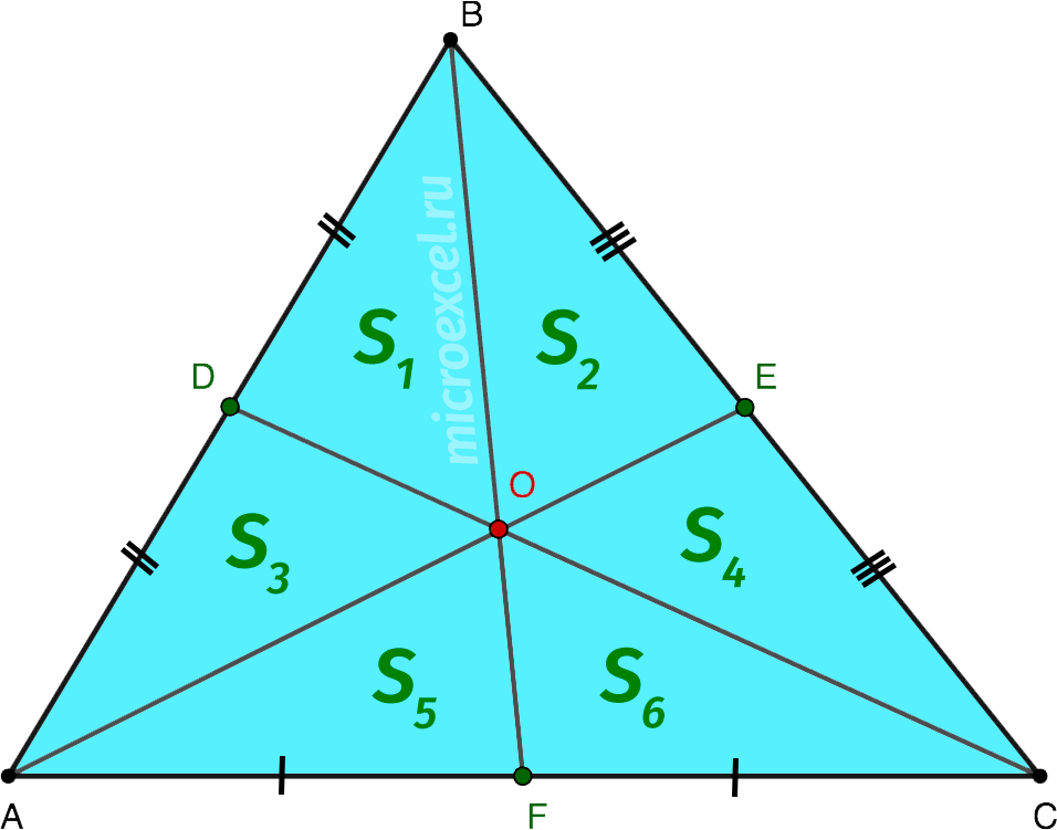 Рис. 1. Три медианы образуют 6 равновеликих треугольников.