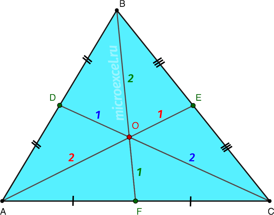 Т.к. в треугольнике три вершины и три стороны, то и медиан, соответственно, тоже три. Все они пересекаются в одной точке (O), которая называется центроидом или центром тяжести треугольника.