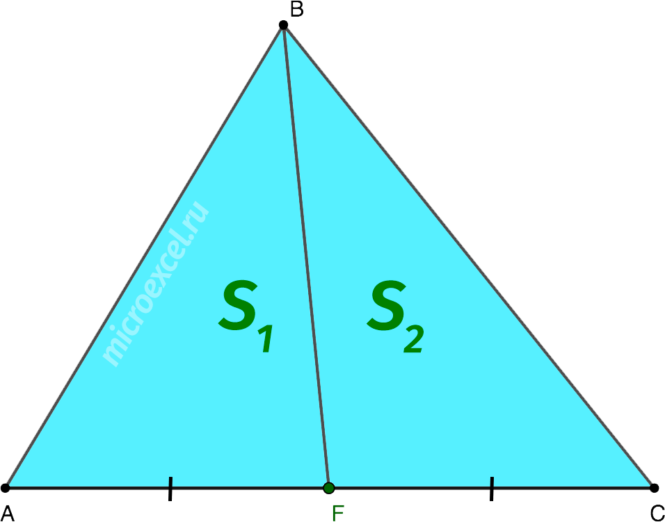 Медиана делит треугольник на 2 равновеликих (равных по площади) треугольника.