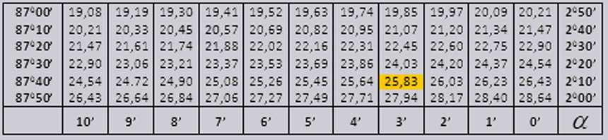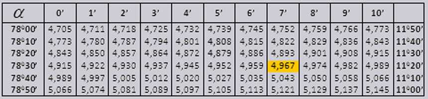 Для значений тангенса до $90°$ и котангенса малого угла поправок нет. Например, найдем $\tan 78°37’$, который по таблице равен $4,967$.