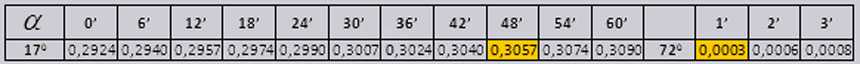 $\sin17°47’=0,3057-0,0003=0,3054$.