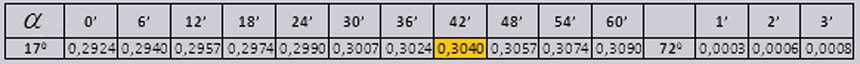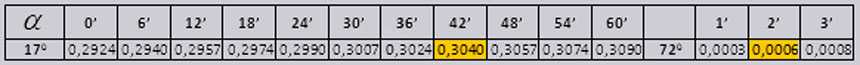 Используя таблицы Брадиса для синусов, найдем $\sin17°42’$. Для этого в столбце слева таблицы синусов и косинусов находим значение градусов – $17°$, а в верхней строке находим значение минут – $42’$. На их пересечении получаем искомое значение: