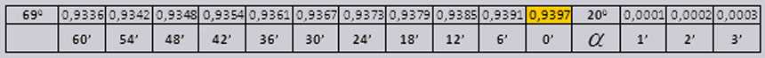 При расчете косинусов выполняем аналогичные действия, но градусы смотрим в правом столбце, а минуты – в нижней колонке таблицы. Например, $\cos20°=0,9397$.