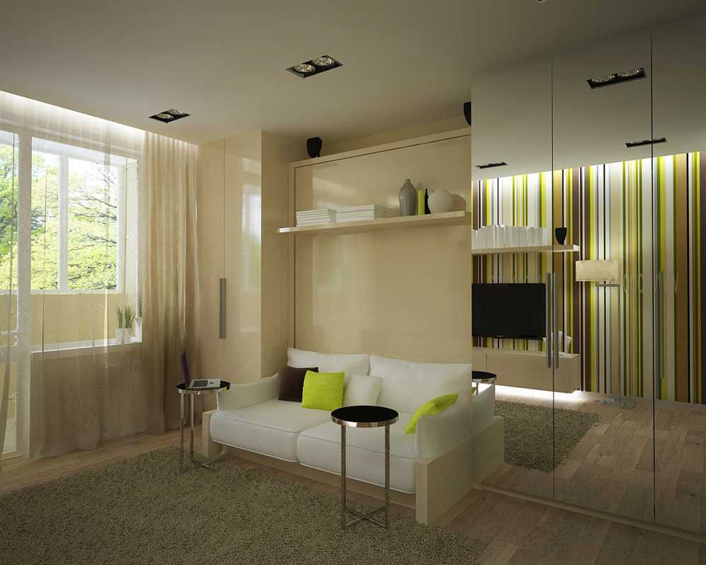 Если говорить об экономии пространства, то не стоит отказывать себе в большом многоместном диване, трансформирующимся в просторную двуспальную кровать. Это даст возможность объединить гостиную и спальню.
