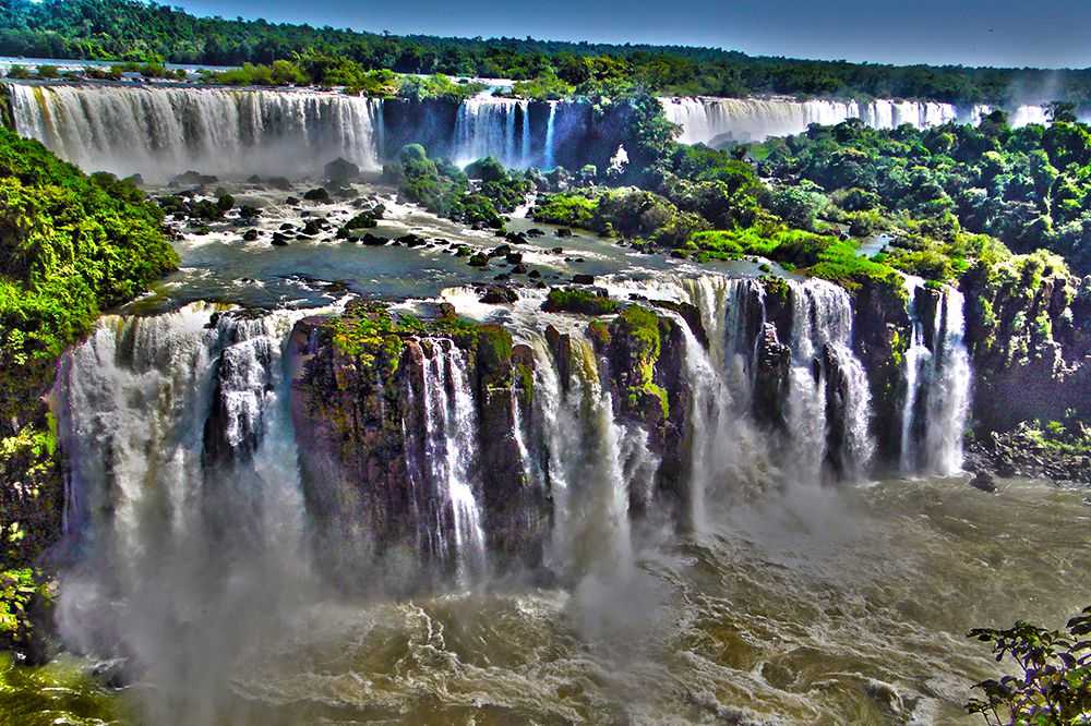 За право обладать величайшим творением природы с конца 1980-х соперничают Бразилия и Аргентина, ведь самый мощный водопад в мире находится в двух странах одновременно. Национальное чудо Игуасу – древнейший памятник природы, крупнейший комплекс водопадов, состоящий из 275 потоков. Высота падения воды варьируется от 60 до 80 метров (это сравнительно небольшая высота), протяженность достигает 3000 метров.