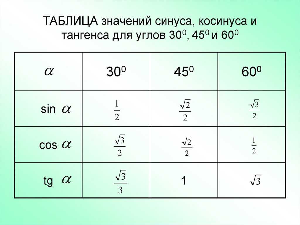 В школьном курсе геометрии предполагается запоминание основных значений тригонометрических функций, собранных в тригонометрической таблице, для удобства решения тригонометрических задач.