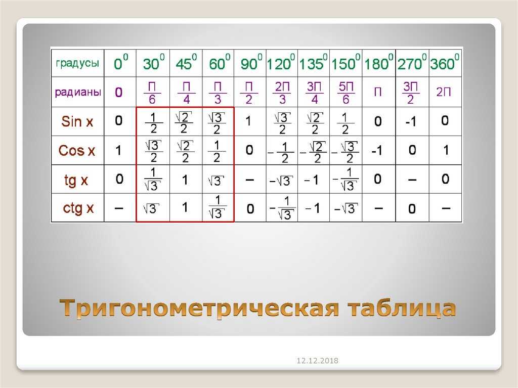 Таблица основных тригонометрических функций для углов 0, 30, 45, 60, 90, … градусов