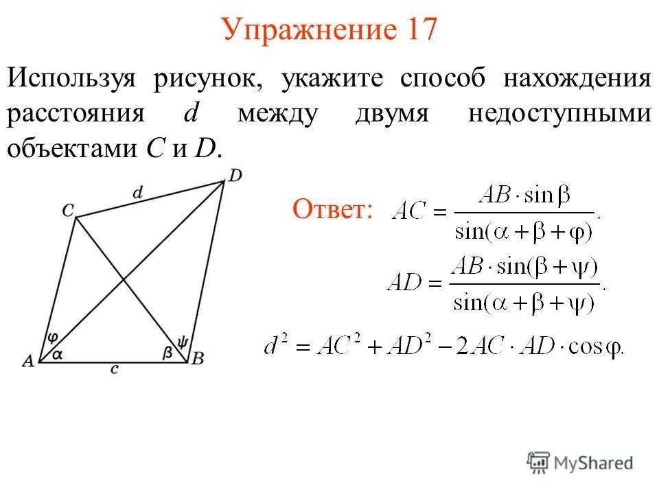 Упражнение 17 Используя рисунок, укажите способ нахождения расстояния d между двумя недоступными объектами C и D. Ответ: