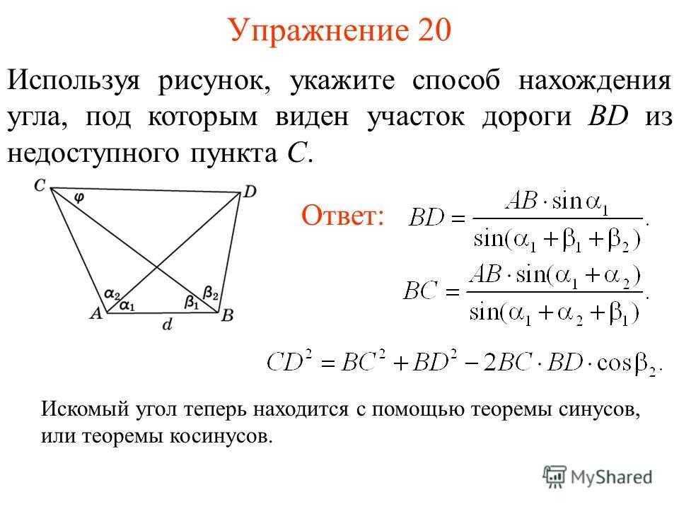 Упражнение 20 Используя рисунок, укажите способ нахождения угла, под которым виден участок дороги BD из недоступного пункта C. Ответ: Искомый угол теперь находится с помощью теоремы синусов, или теоремы косинусов.