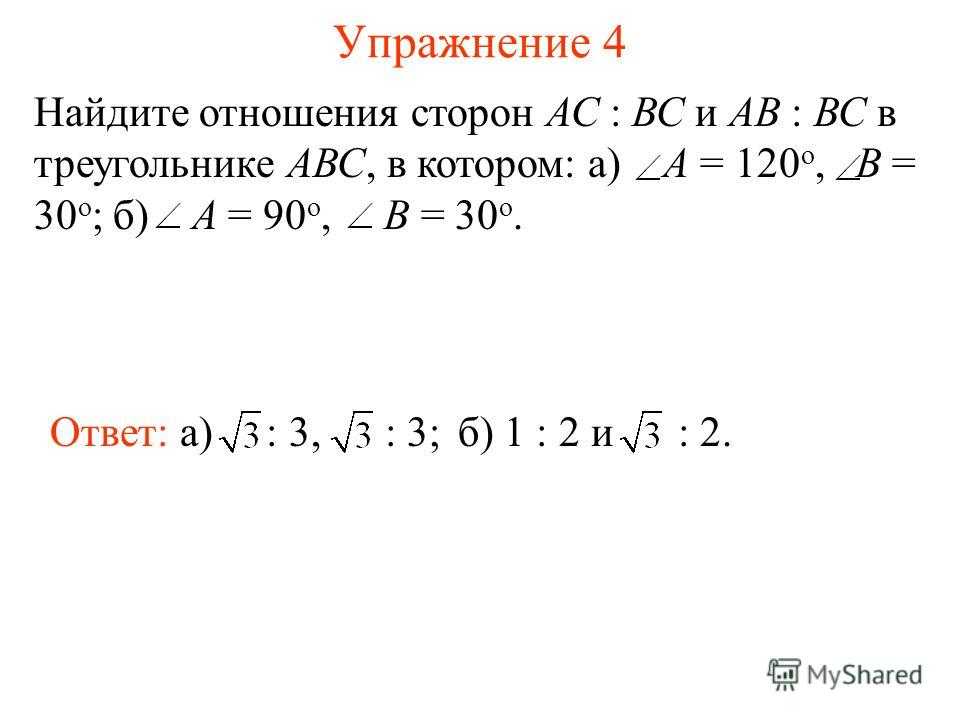 Упражнение 4 Найдите отношения сторон АС : ВС и АВ : ВС в треугольнике АВС, в котором: а) A = 120 о, B = 30 о ; б) A = 90 о, B = 30 о. Ответ: а) : 3, : 3;б) 1 : 2 и : 2.