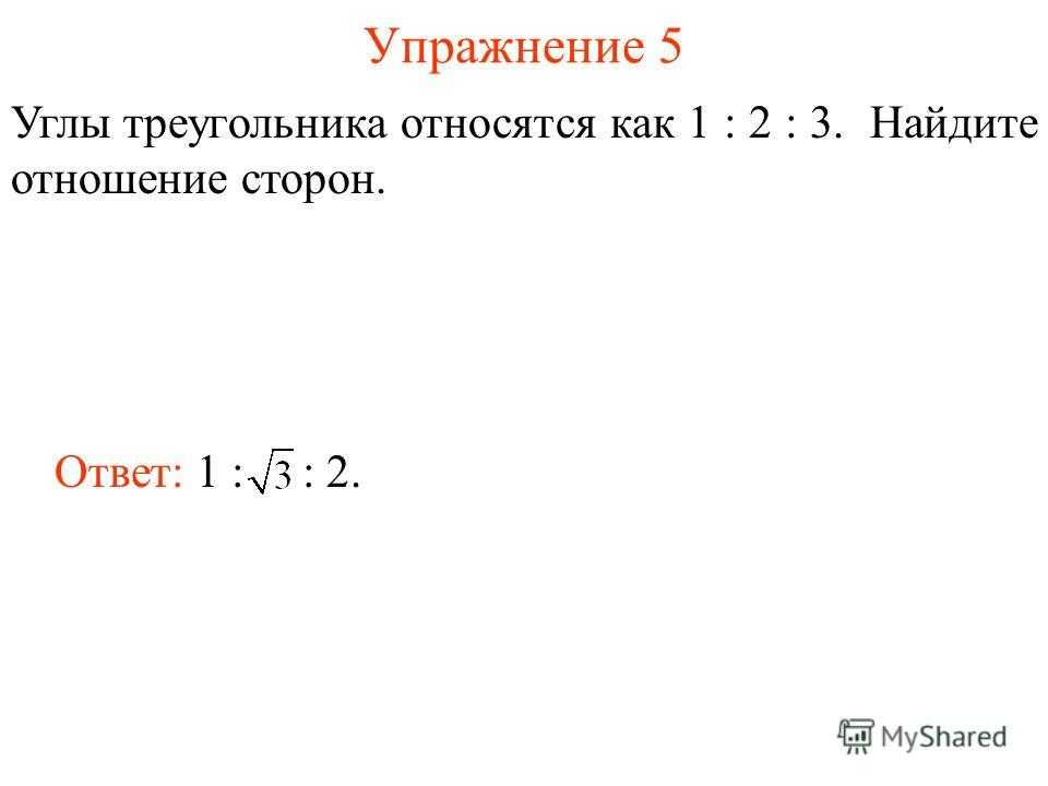 Упражнение 5 Углы треугольника относятся как 1 : 2 : 3. Найдите отношение сторон. Ответ: 1 : : 2.