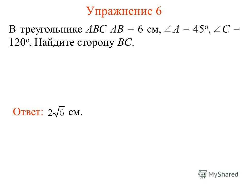Упражнение 6 В треугольнике АВС АВ = 6 см, A = 45 о, С = 120 о. Найдите сторону BC. Ответ: см.