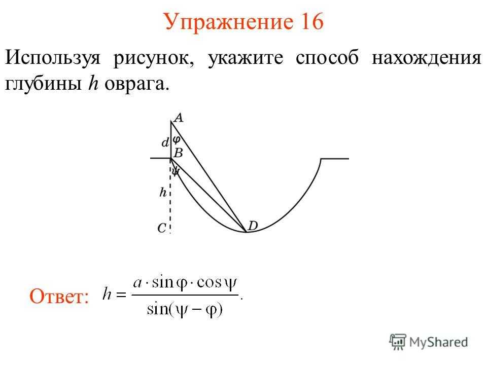 Упражнение 16 Используя рисунок, укажите способ нахождения глубины h оврага. Ответ:
