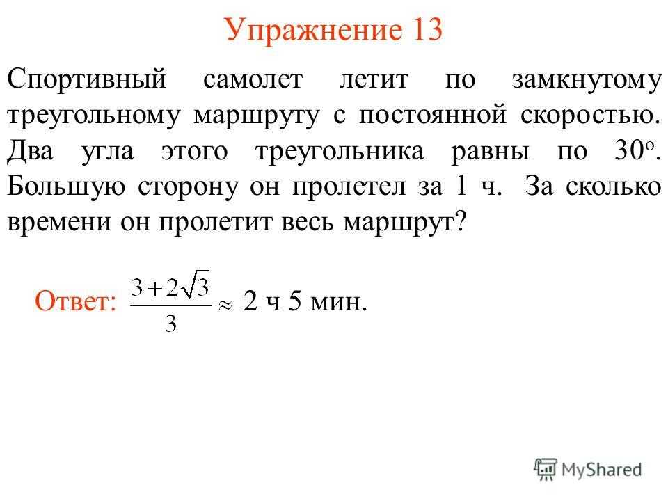 Упражнение 13 Спортивный самолет летит по замкнутому треугольному маршруту с постоянной скоростью. Два угла этого треугольника равны по 30 о. Большую сторону он пролетел за 1 ч. За сколько времени он пролетит весь маршрут? Ответ: 2 ч 5 мин.