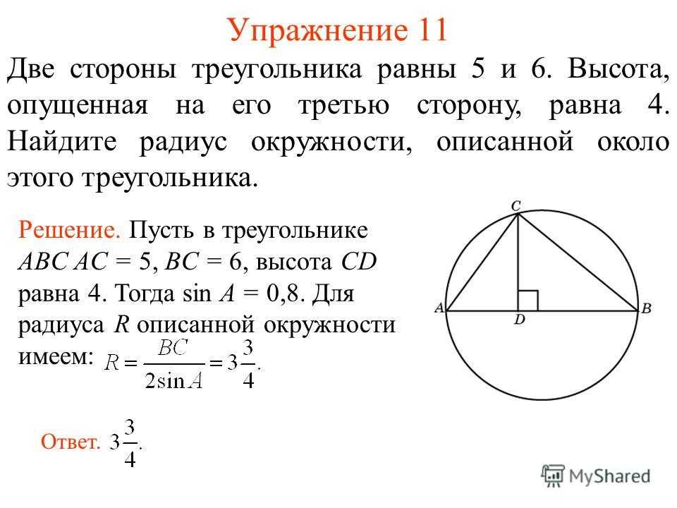 Упражнение 11 Две стороны треугольника равны 5 и 6. Высота, опущенная на его третью сторону, равна 4. Найдите радиус окружности, описанной около этого треугольника. Решение. Пусть в треугольнике ABC AC = 5, BC = 6, высота CD равна 4. Тогда sin A = 0,8. Для радиуса R описанной окружности имеем: Ответ.