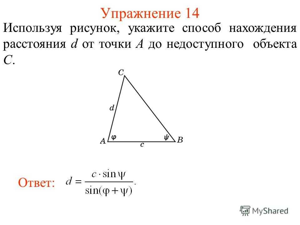 Упражнение 14 Используя рисунок, укажите способ нахождения расстояния d от точки A до недоступного объекта C. Ответ: