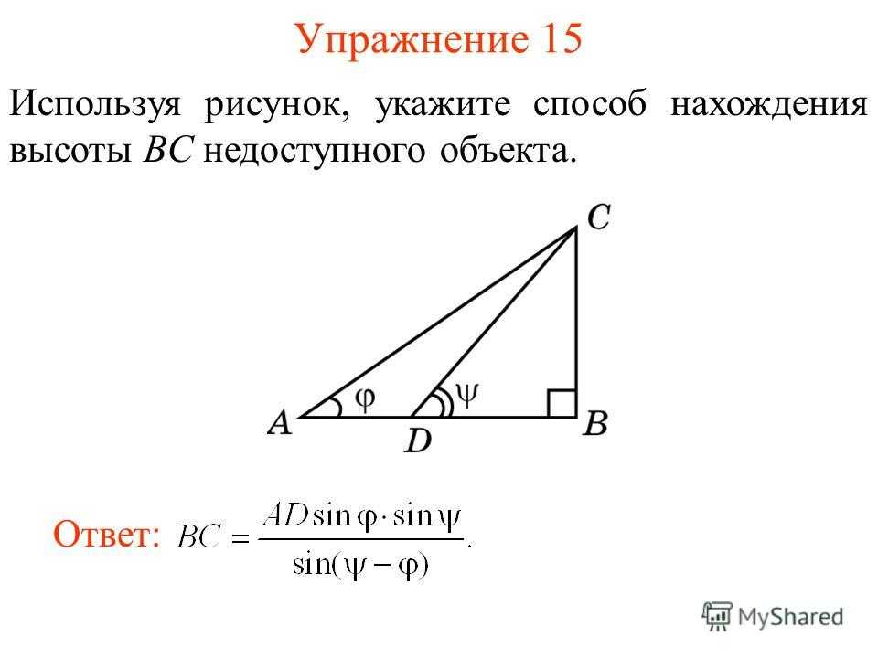 Упражнение 15 Используя рисунок, укажите способ нахождения высоты BC недоступного объекта. Ответ: