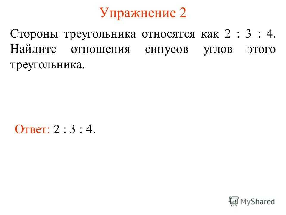 Упражнение 2 Ответ: 2 : 3 : 4. Стороны треугольника относятся как 2 : 3 : 4. Найдите отношения синусов углов этого треугольника.