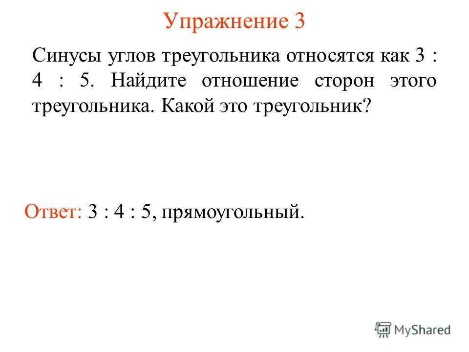 Упражнение 3 Ответ: 3 : 4 : 5, прямоугольный. Синусы углов треугольника относятся как 3 : 4 : 5. Найдите отношение сторон этого треугольника. Какой это треугольник?