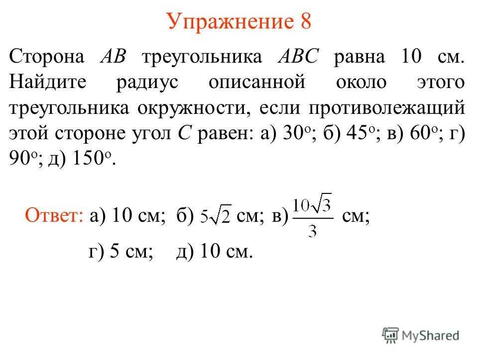 Упражнение 8 Сторона AB треугольника ABC равна 10 см. Найдите радиус описанной около этого треугольника окружности, если противолежащий этой стороне угол C равен: а) 30 о ; б) 45 о ; в) 60 о ; г) 90 о ; д) 150 о. Ответ: а) 10 см; г) 5 см;д) 10 см. б) см; в) см;