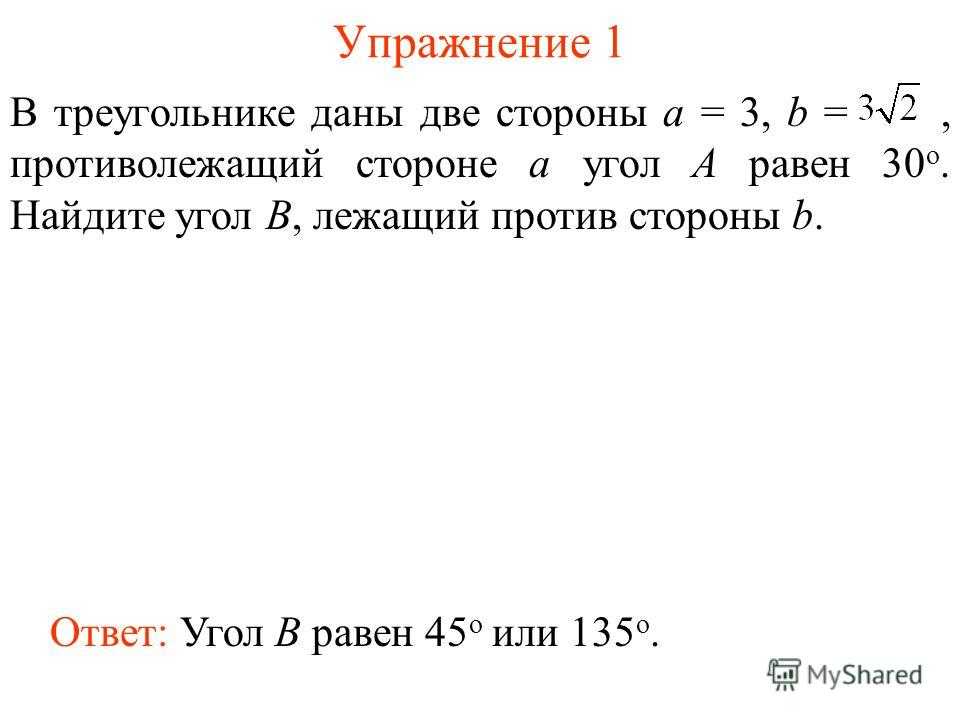 Упражнение 1 Ответ: Угол B равен 45 о или 135 о. В треугольнике даны две стороны а = 3, b =, противолежащий стороне а угол А равен 30 о. Найдите угол B, лежащий против стороны b.