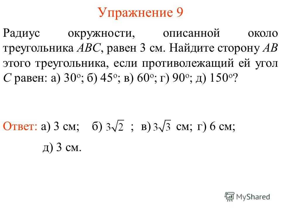 Упражнение 9 Радиус окружности, описанной около треугольника ABC, равен 3 см. Найдите сторону AB этого треугольника, если противолежащий ей угол C равен: а) 30 о ; б) 45 о ; в) 60 о ; г) 90 о ; д) 150 о ? Ответ: а) 3 см;г) 6 см; д) 3 см. б) ;в) см;