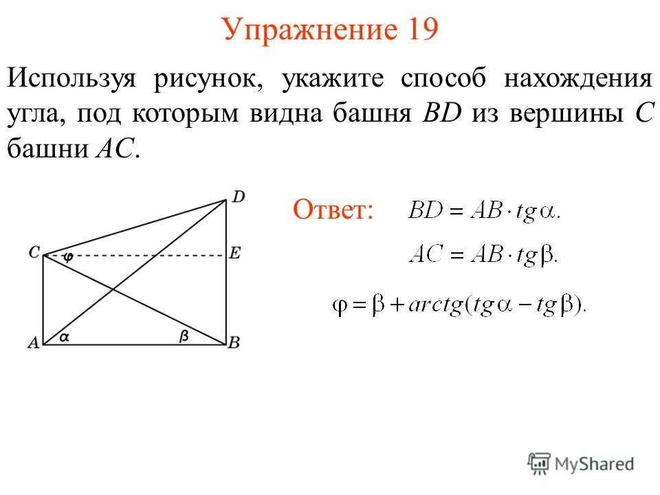 Упражнение 19 Используя рисунок, укажите способ нахождения угла, под которым видна башня BD из вершины C башни AC. Ответ: