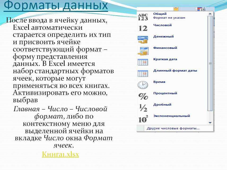 - Числовой. Для ввода числовых данных, которые будут участвовать в различных формулах и статистике, следует использовать именно этот формат. …