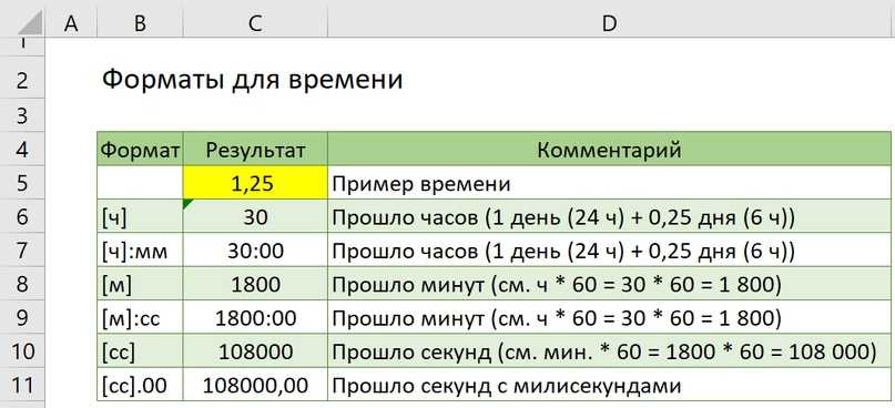 Прошедшее время — это особый случай для отображения значений, превышающих 24 для часов и 60 для минут и секунд. Достаточно добавить квадратные скобки [], чтобы увидеть в ячейке сколько прошло часов, минут и секунд. На следующем экране показано, как Excel показывает прошедшее время, основанное на значении в D5, которое составляет 1,25 дня: