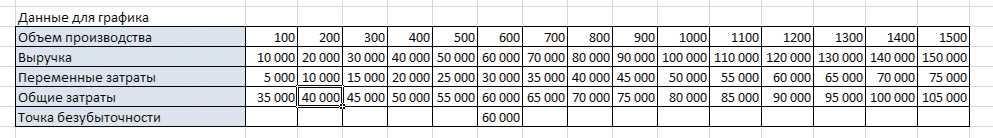 Данные для графика нам предстоит высчитывать. Объем производства берем произвольно, от 100 с шагом по 100 штук. Выручка и Переменные затраты считаются как умножение объема производства на цену и удельную себестоимость. Общие затраты – это сумма постоянных и переменных затрат. Точка безубыточности считается по формуле, которую мы вывели ранее: