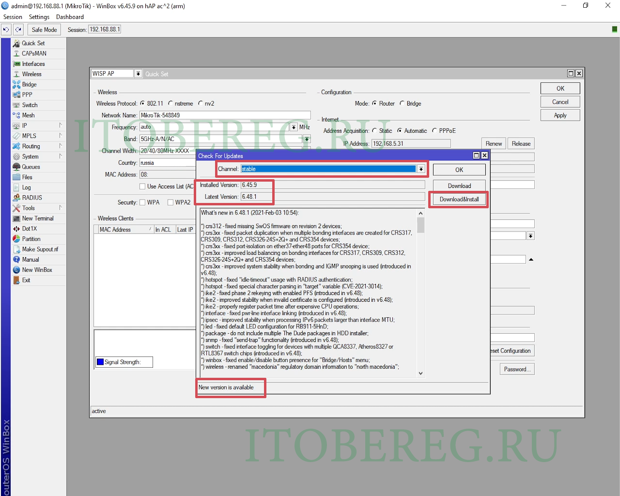 В открывшемся окне, в поле «Chanel» выбираем «Stable». Этим мы указываем маршрутизатору, что искать обновления нужно среди стабильных сборок. Если доступна более новая версия, нажимаем кнопку «Download&Install». После этого будет скачена и установлена последняя версия RouterOS