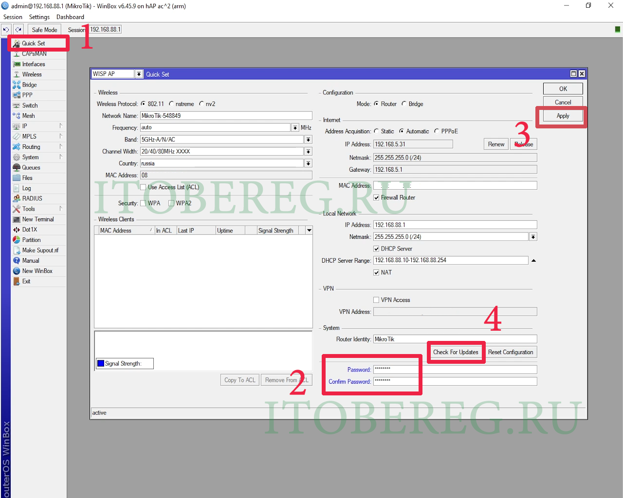 Первым делом, при новой настройке маршрутизатора, нужно установить пароль и обновить MikroTik (Более подробно о том, как обновить MikroTik через winbox или через web-интерфейс, можете прочитать в нашей статье «Обновление MikroTik RouterOS и Firmware»).