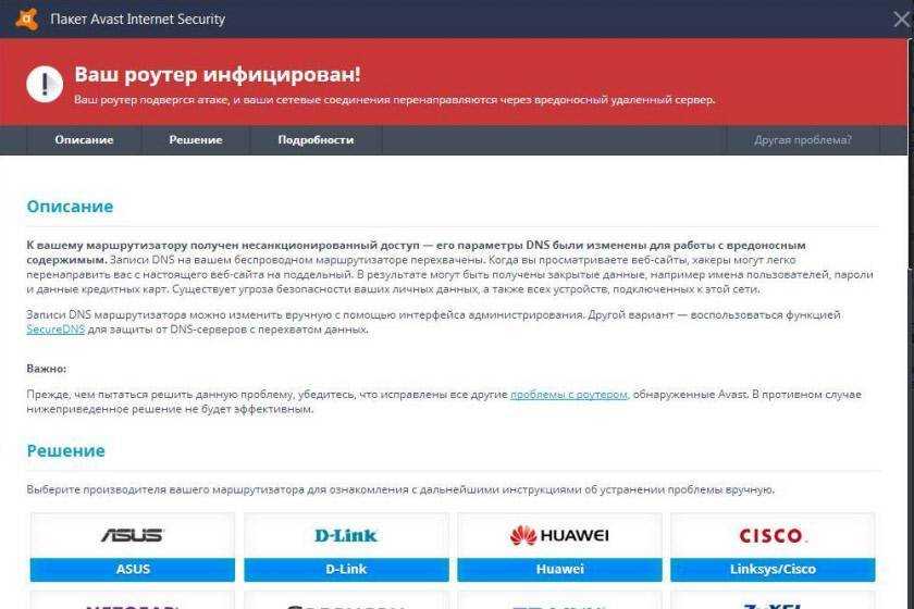 В отдельных случаях можно увидеть сообщение, что ваш роутер инфицирован, и соединения перенаправляются на вредоносный сервер. Антивирус Avast объясняет это тем, что ваш роутер был взломан, и в нем были изменены DNS-адреса на вредоносные. И там же предоставлены инструкции по решению этой проблемы для разных роутеров: ASUS, TP-Link, ZyXEL, D-Link, Huawei, Linksys/Cisco, NETGEAR, Sagem/Sagemco.