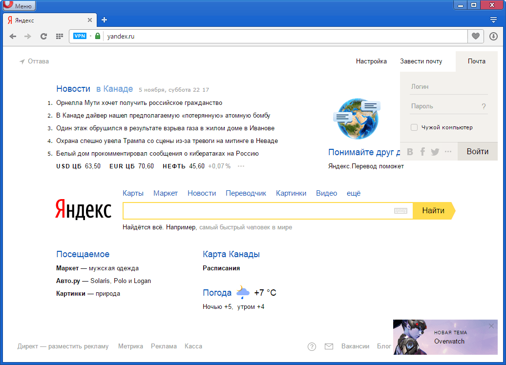 Обновив страницу, виден результат работы VPN сервиса — теперь «Яндекс» считает, что пользователь в Канаде. Вывод: все функции сервиса исправно работают сразу же после установки.