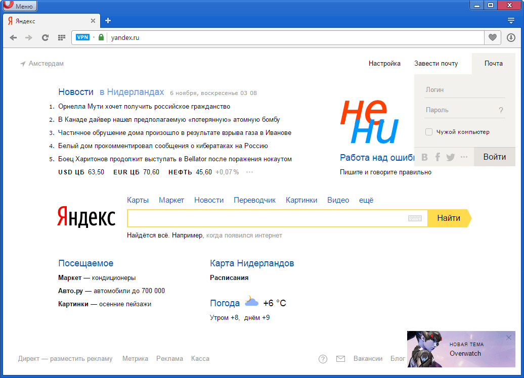 Вот что показывает браузер Opera, если после включения VPN оставить настройки этого сервиса по умолчанию и перейти на сайт yandex.ru: