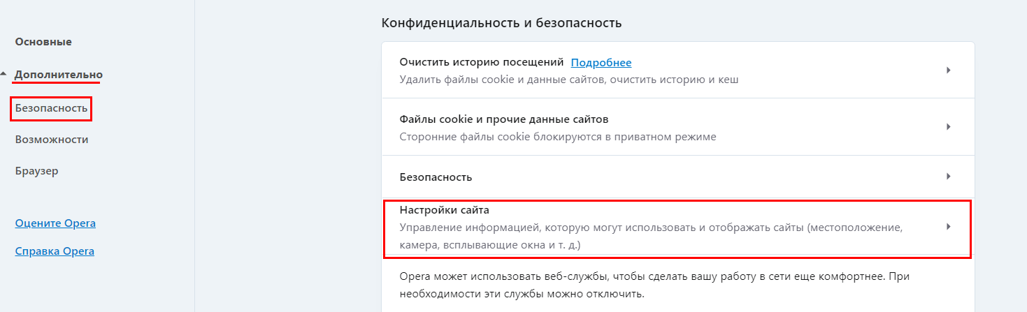 Для начала следует открыть настройки. Чтобы это сделать, следует кликнуть ЛКМ по иконке программы в верхнем левом углу и найти пункт с соответствующим названием. Также можно воспользоваться сочетанием клавиш Alt+P. Далее среди значительного перечня параметров нужно перейти в «Настройки сайта». Расположены они в следующем разделе: