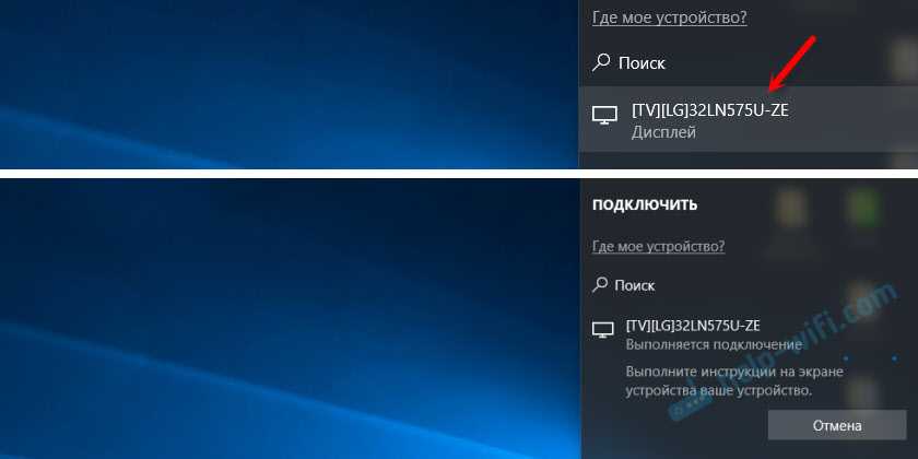 В этом меню (неважно каким способом вы его будете открывать) выбираем свой телевизор/проектор/адаптер. После чего сразу начнется процесс подключения