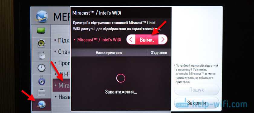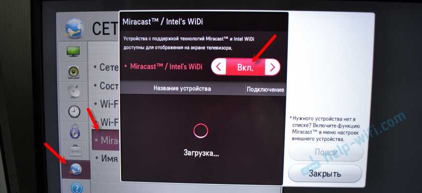 На телевизоре или проекторе нужно включить Miracast. Если у вас адаптер, он так же должен быть переключен в режим Miracast. На разных устройствах это делается по-разному. Например, на моем старом телевизоре LG эти настройки находятся в разделе «Сеть». Пункт «Miracast/Intel WiDi». Включаем его.