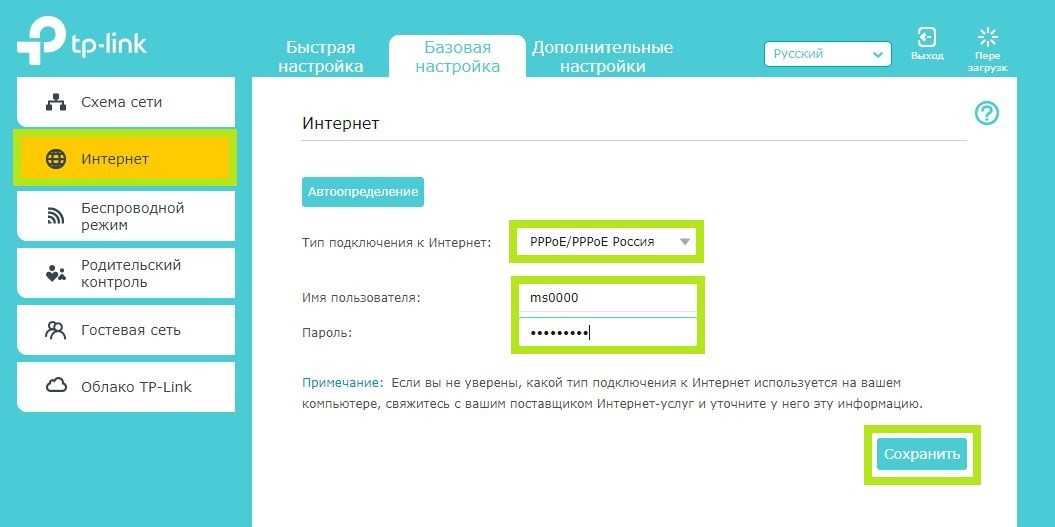 В открывшемся окне, в графе “Тип подключения к Интернет” выбираем “РРРоЕ/РРРоЕ Россия”. “Имя пользователя” и пароль указаны в Вашем договоре в графе “Аутентификационные данные”. Обязательно подтвердите пароль и нажмите на кнопку “Сохранить”. Если все ввели правильно – подключение будет выполнено.