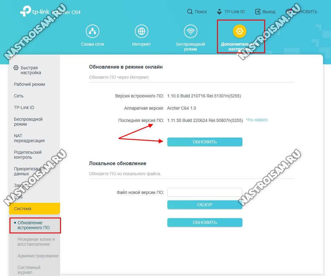 Чтобы перепрошить TP-Link Archer C64 на новую прошивку, надо открыть «Дополнительные настройки» → «Система» → «Обновление встроенного ПО».