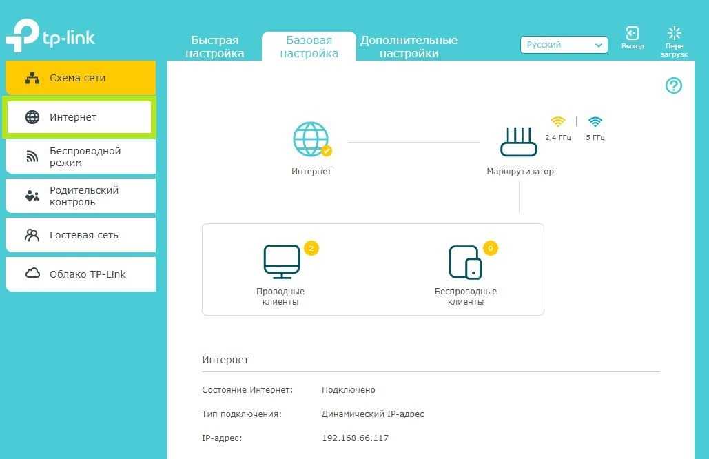 После авторизации откроется интерфейс роутера. Выходим из мастера быстрой настройки нажав “Выход”. В столбце слева нужно выбрать пункт “Интернет”.