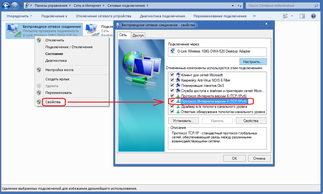 Нажимаем правой кнопкой мыши на тот адаптер, через который ваш ноутбук подключен к интернету. Выбираем Свойства.