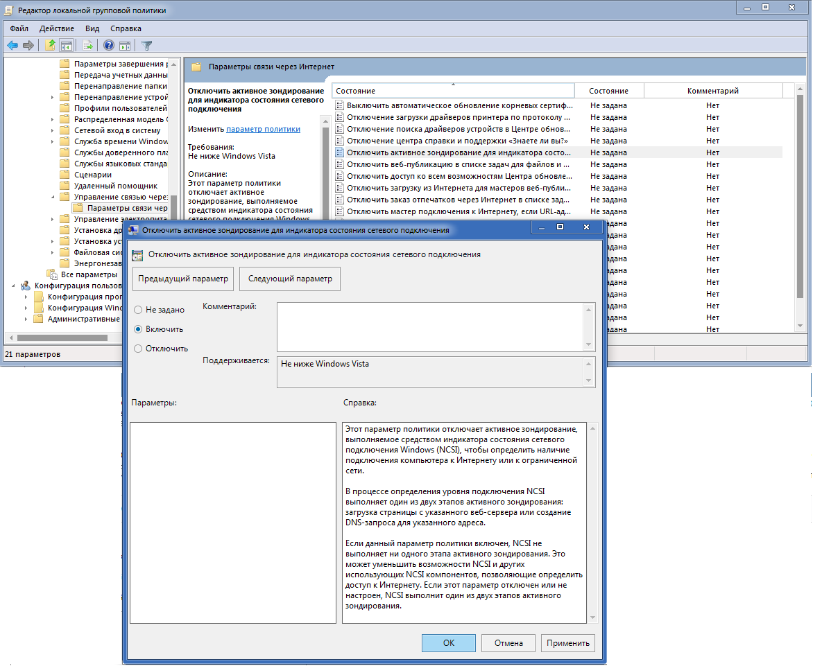 Таким образом Вы отключаете активное зондирование. В результате система прекратит проверять состояния сетевого подключения Windows на подключение компьютера к Интернету или к ограниченной сети.