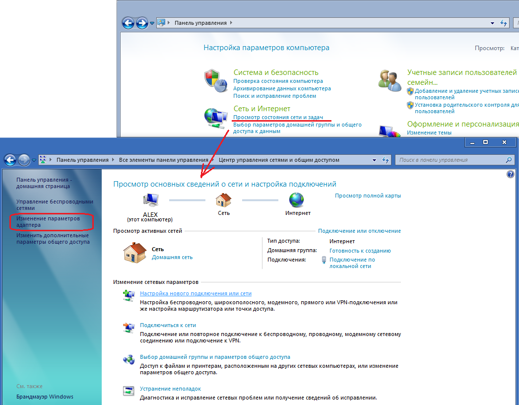 Здесь в «Центре управления сетями и общим доступом» нужно зайти в «Изменение параметров адаптера»