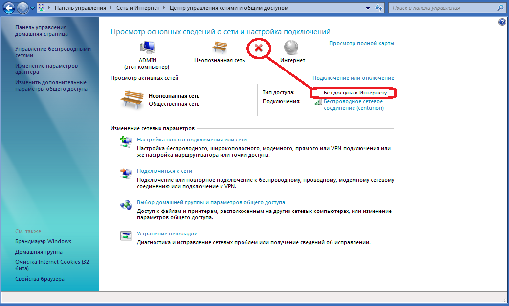 Эта ситуация встречается чаще всего. Зачастую причиной этой проблемы является незнание пользователем некоторых вопросов функционирования компьютерной техники. Так, например, большинство пользователей вообще понятия не имеют, что такое IP-адрес. Они думают, чтобы подключить Wi-Fi нужно только ввести ключ безопасности сети. Хотя инструкций как создать домашнюю WiFi сеть найти достаточно легко. В большинстве случаев этого в самом деле достаточно. Однако, если в WiFi-роутере отключен протокол DHCP, то подключение к сети пройдет без проблем, но вот IP-адрес вашему беспроводному адаптеру на ноутбуке, планшете или смартфоне выделен не будет. В результате вы не получите доступ в Интернет, хотя в действительности сеть подключена, но частично.Между прочим данная проблема возможна и с проводным подключением — кабель вставили, а адрес не получили.Что же здесь можно сделать? Прописать IP-адрес вручную. Для того чтобы прописать IP-адрес в Windows 7 или 8 необходимо:Открывает Панель управления и выбираем Центра управления сетями и общим доступом:
