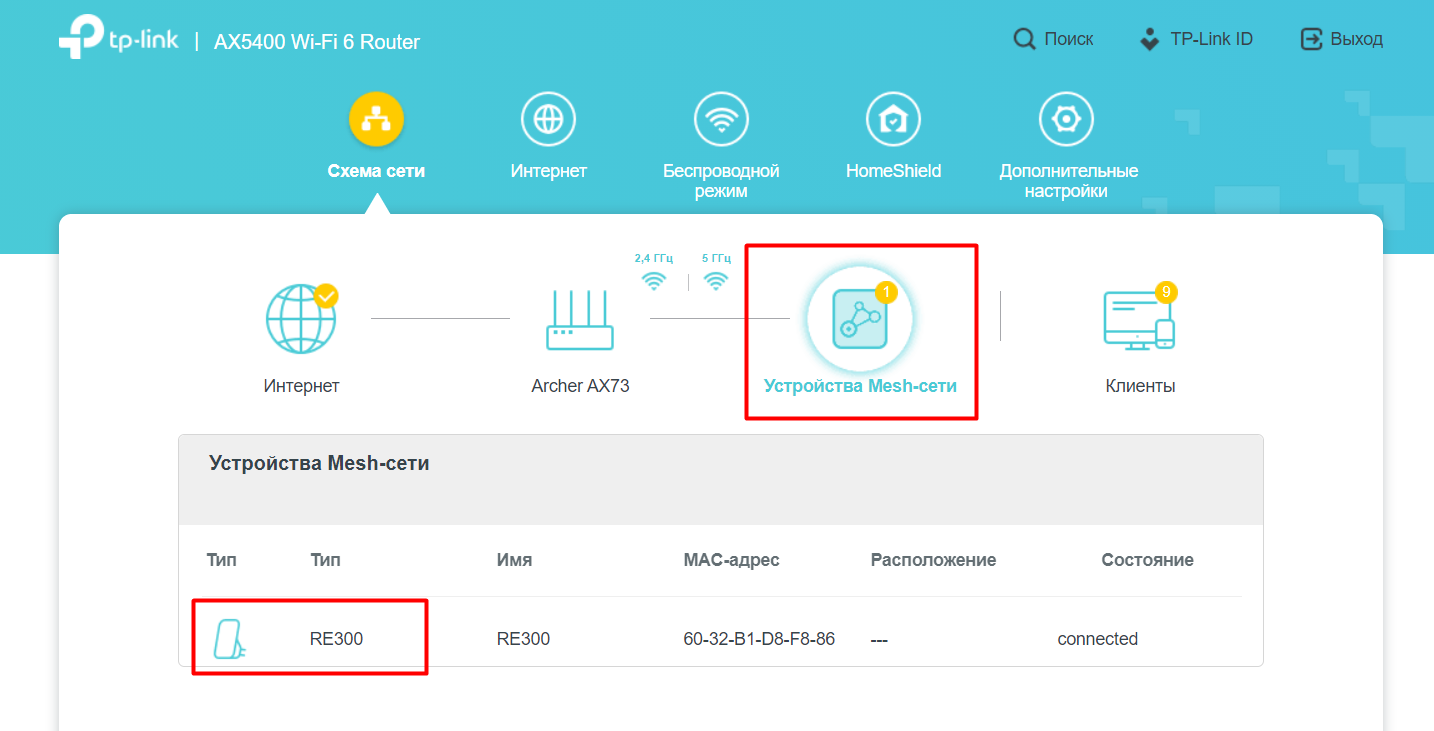 Ничего отдельного настраивать не нужно. Поддержка OneMesh должна определиться автоматически. Показываю на своем примере. В настоящий момент мой основной роутер TP-Link AX73 (Wi-Fi 6). К нему подключен усилитель Wi-Fi TP-Link RE300 (кстати, очень популярная и недорогая модель, прошедшая проверку временем).