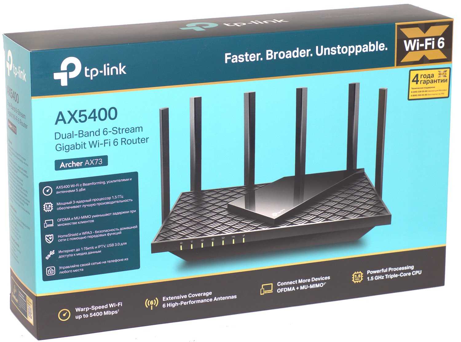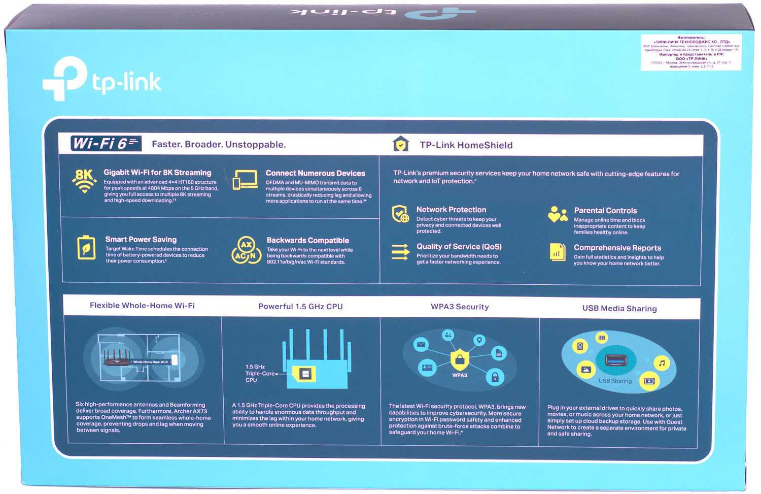 По общему оформлению коробки с роутером TP-Link Archer AX73 сразу становится понятным, что перед нами двухдиапазонный роутер стандарта Wi-Fi 6, имеющий шесть антенн с поддержкой технологии направленного луча Beamforming, способный обеспечить скорость беспроводной связи суммарно до 5400 Мбит/сек и защиту данных HomeShield. Информация на коробке также говорит об использовании трехъядерного процессора с частотой 1.5 ГГц и наличии порта USB 3.0, а значит, общая производительность роутера должна быть на приличном уровне. Подробно ключевые элементы «раскрываются» с обратной стороны коробки